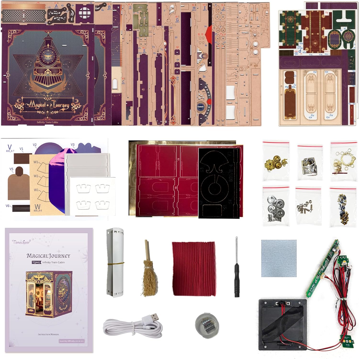 Crafted with larger dimensions and premium materials—velvet, leather, and elegant gold trim—this miniature house kit exudes luxury. A transparent acrylic panel adorns the carriage door, keeping your creation dust-free while showcasing its enchanted details.
