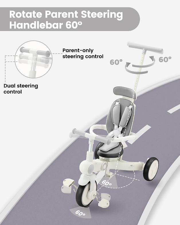 Want a ride-on toy that grows with your little one from 18 months to 5 years? Our 7-in-1 Toddler Tricycle transforms seamlessly between modes for every stage—parent-guided, independent, balance training, and more. With silent wheels, safety-first design, and adjustable features, it’s perfect for indoor play, park adventures, family trips, and daily walks—no need for multiple bikes as your child develops!