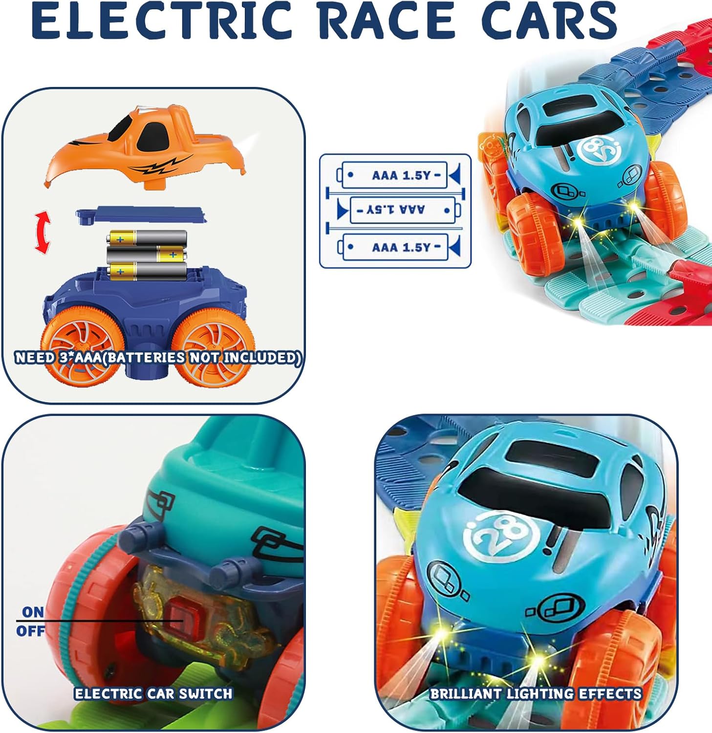 - Power Source: Battery-powered cars (included)